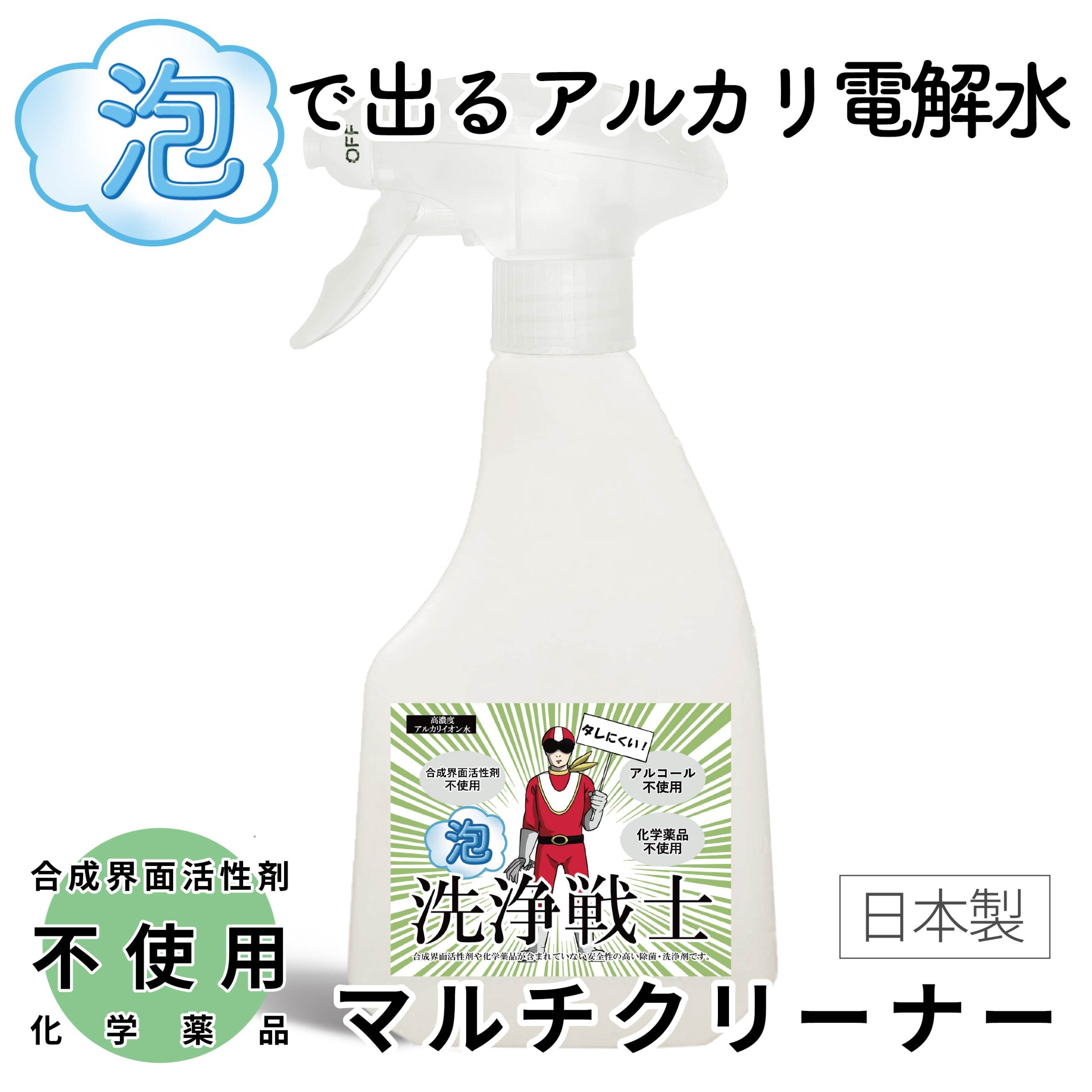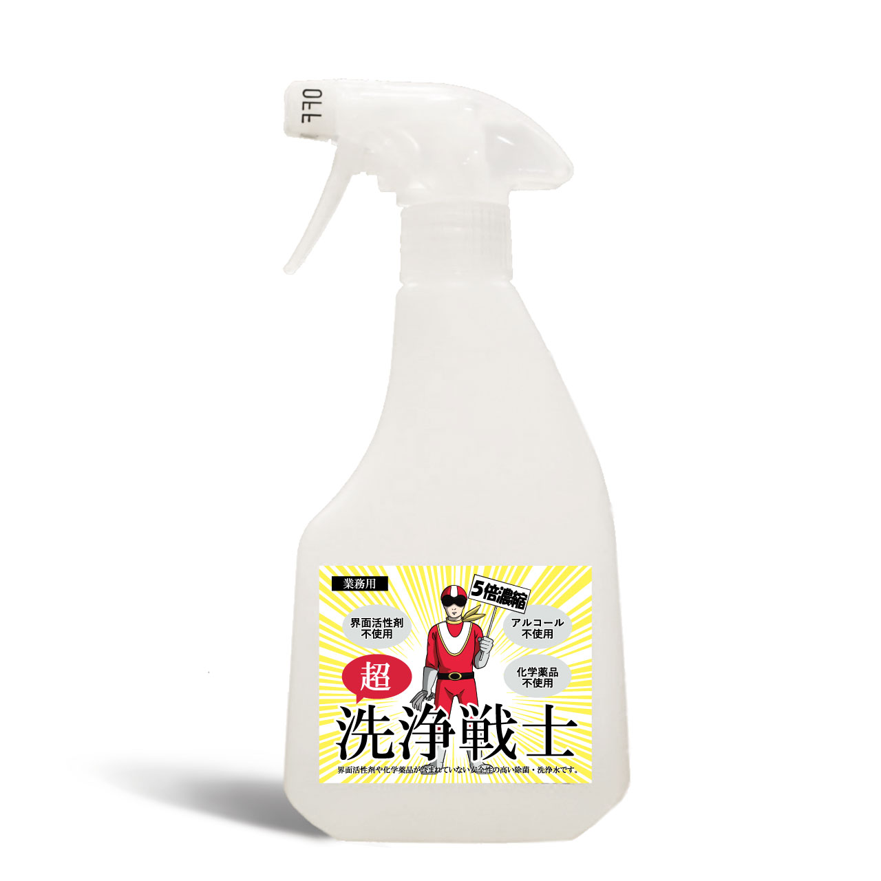 洗浄戦士は、合成界面活性剤や化学薬品を一切使用せず、特殊技術により電気分解されたpH13以上のアルカリイオン水を利用した洗浄水・洗浄剤です。