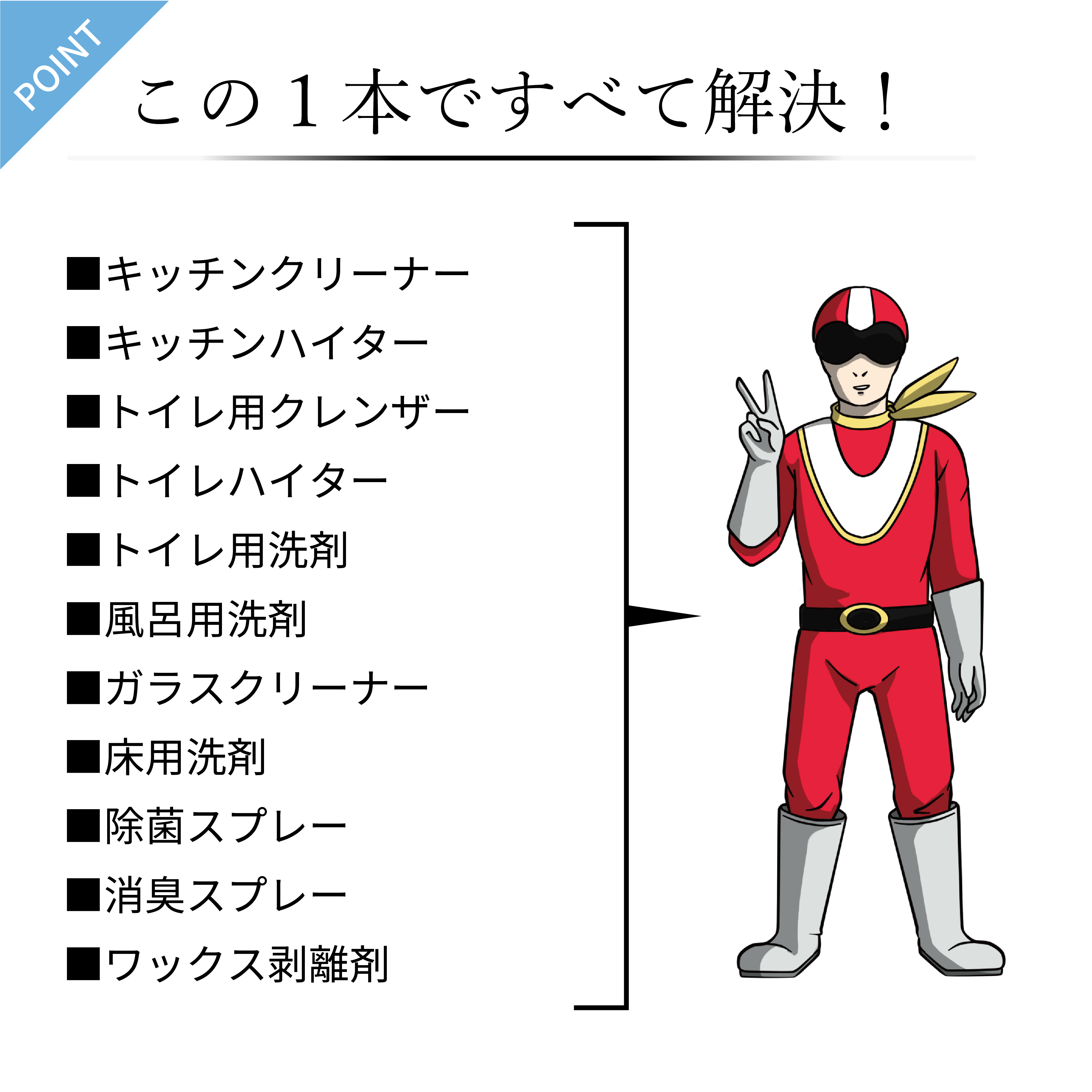 洗浄戦士は、日常の洗浄に用いる洗剤類、消臭剤、アルコールなどの様々な洗剤の効果をこれ1本で解決できます。
